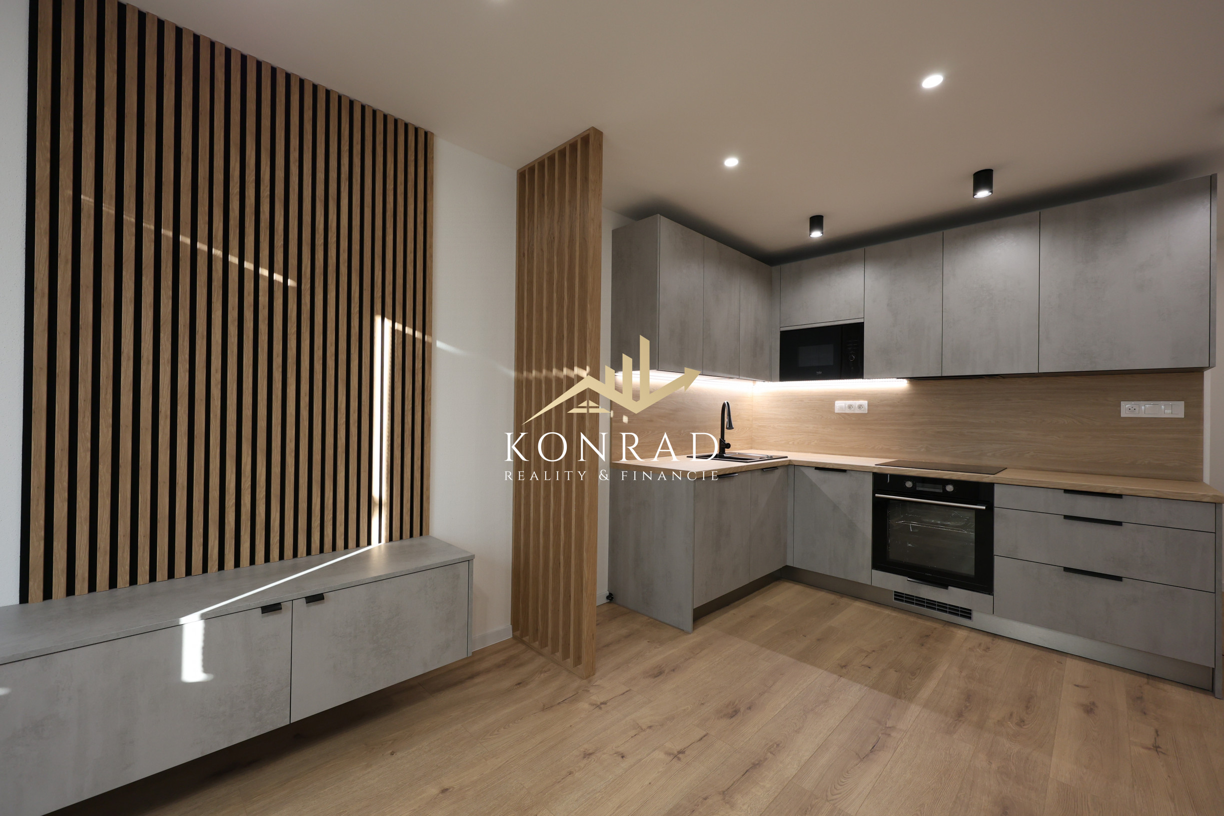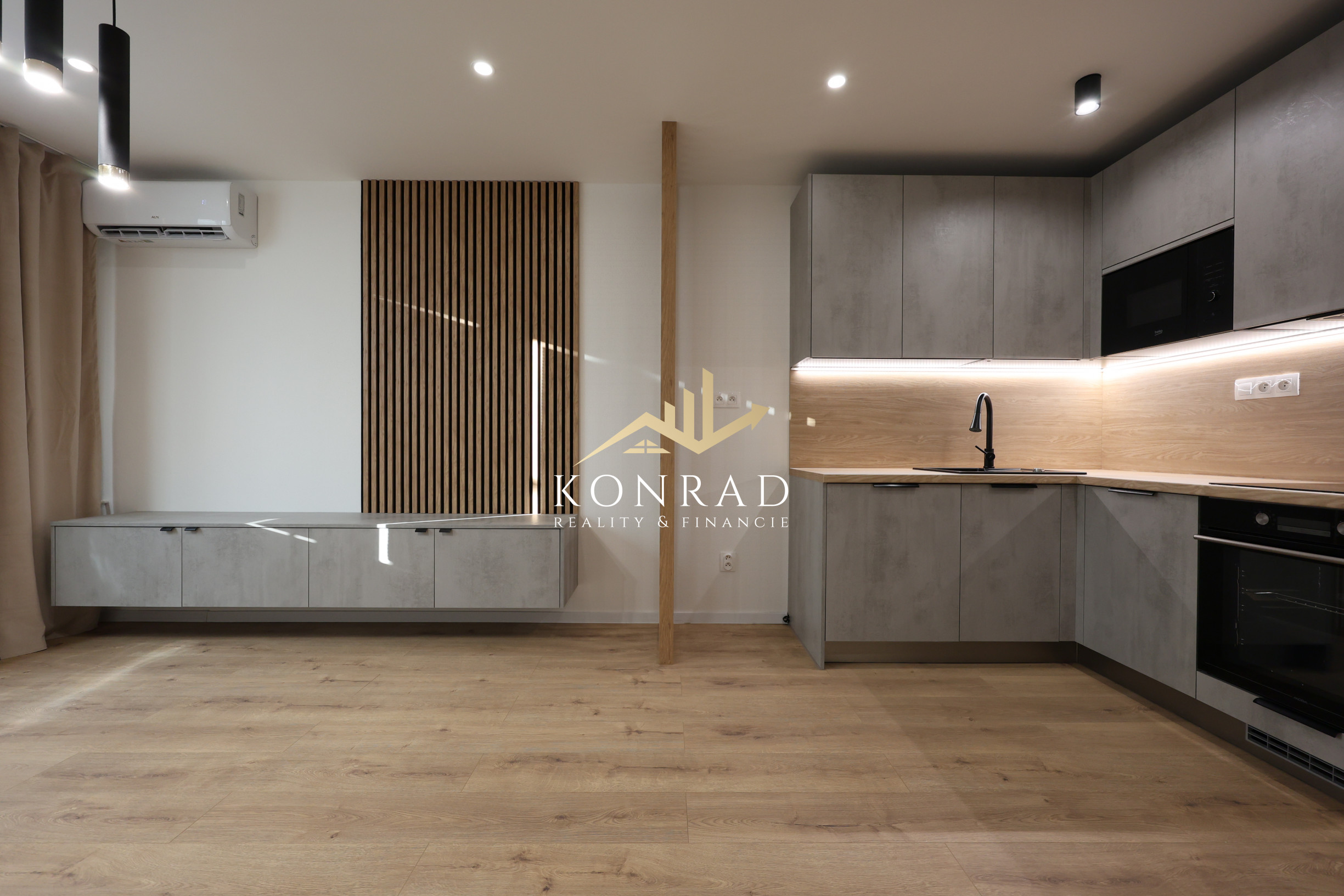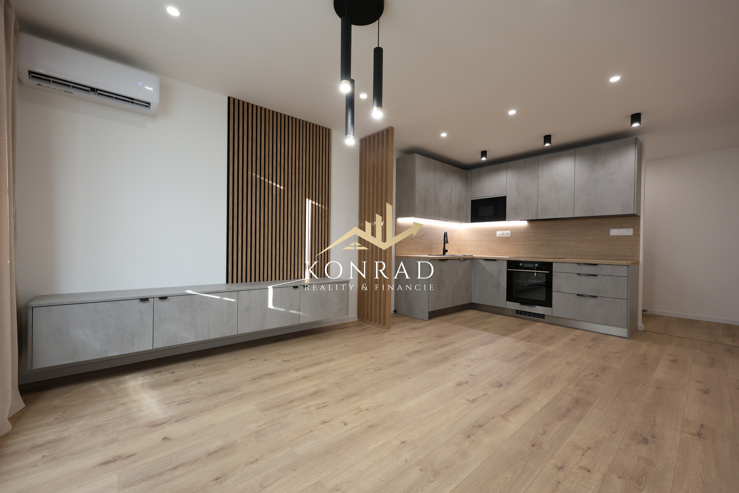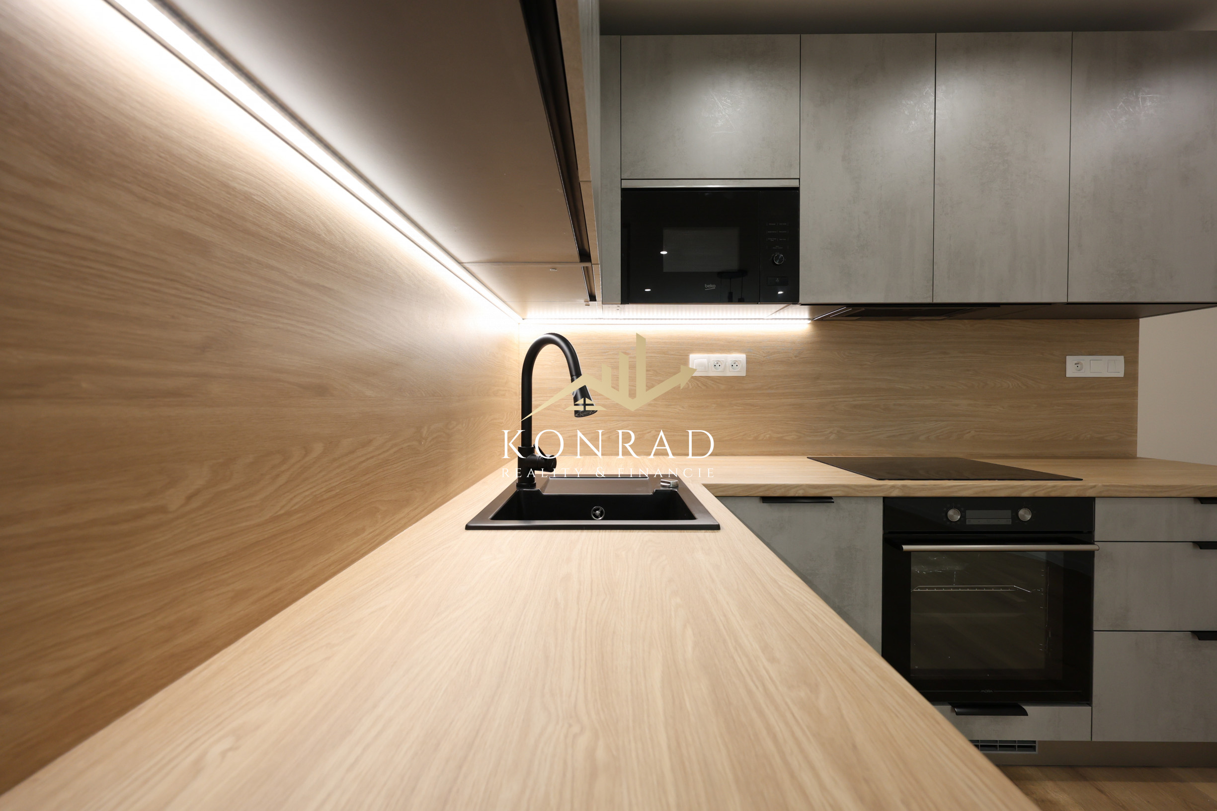 Byt je navyše vybavený klimatizáciou, kuchynskými spotrebičmi a na mieru vyrobenou kuchynskou linkou a nábytkom v obývacej izbe