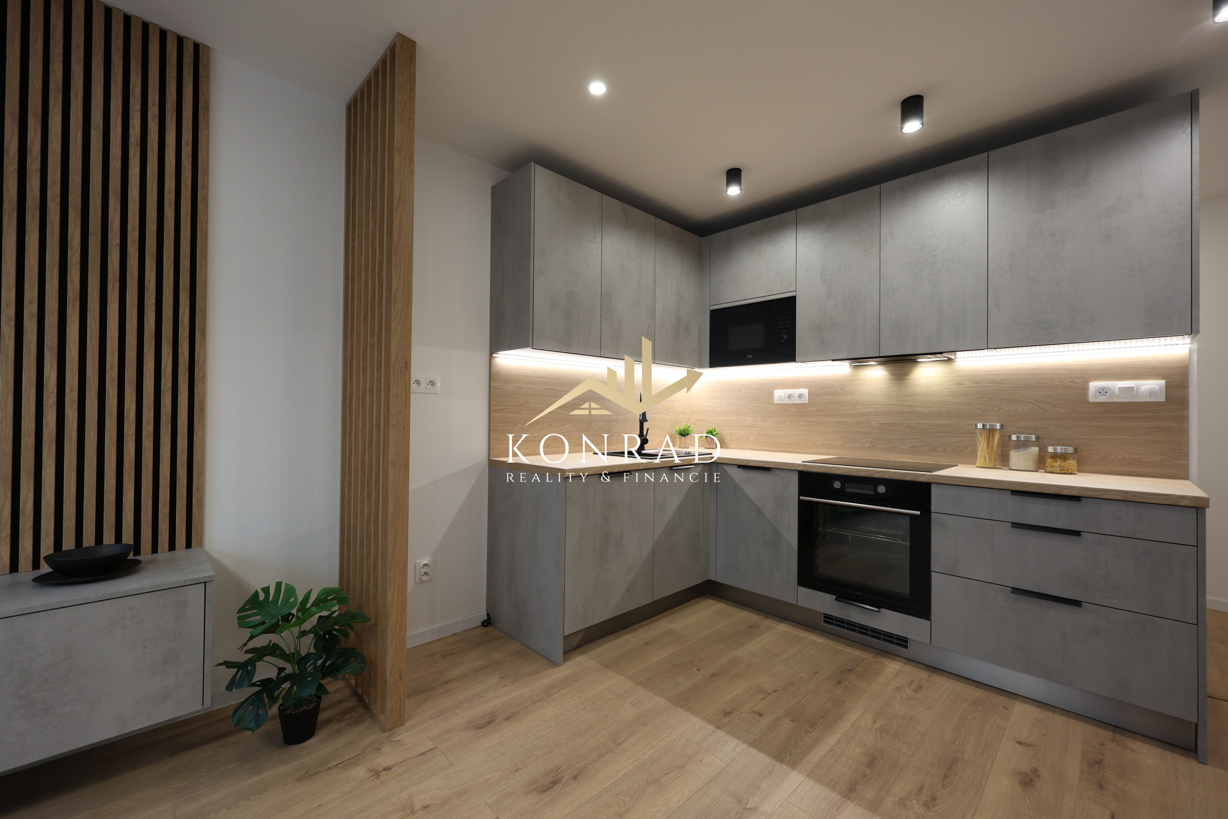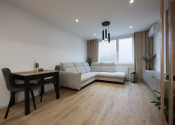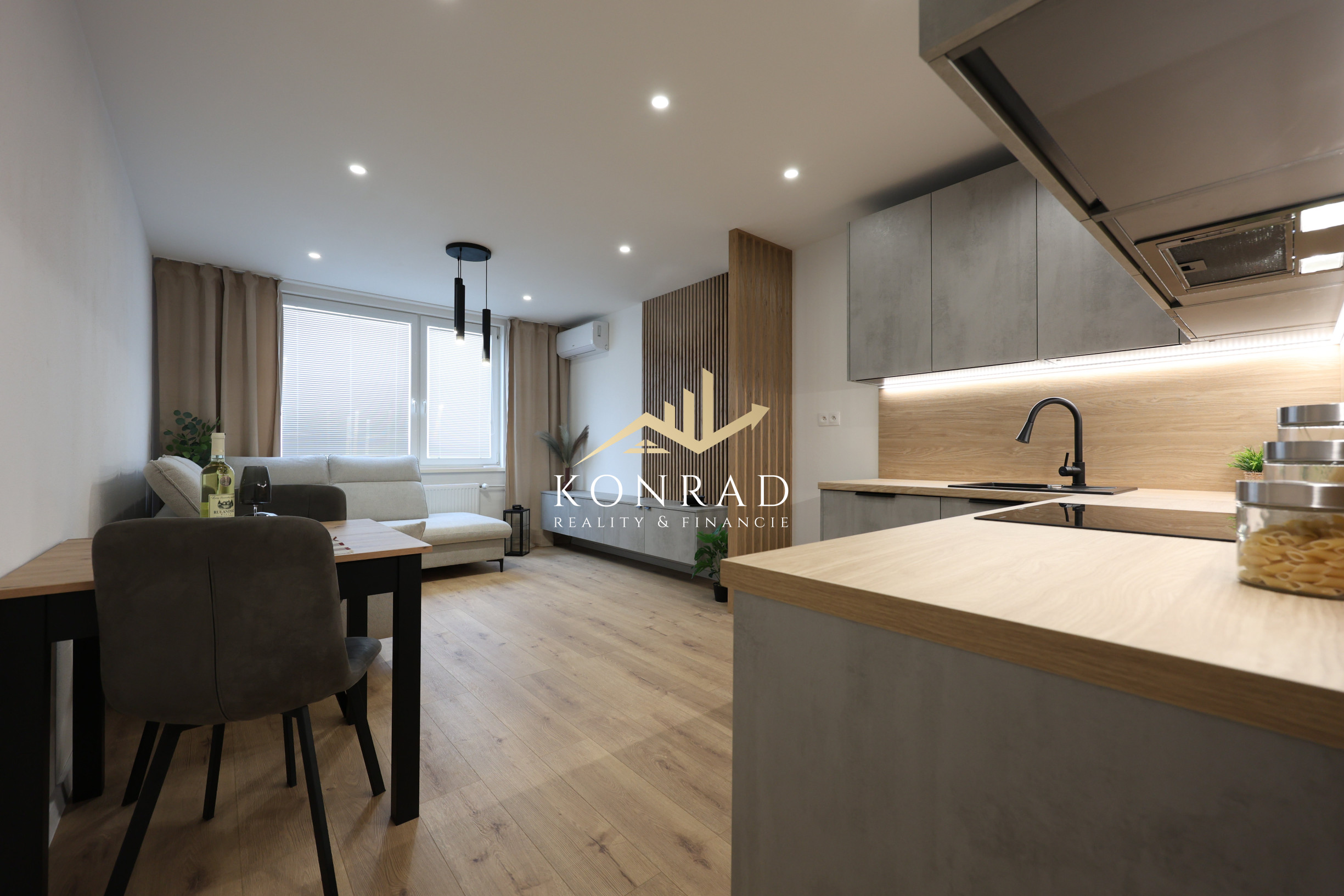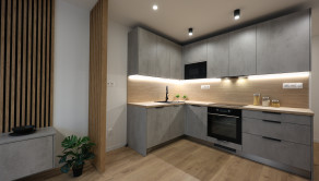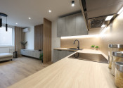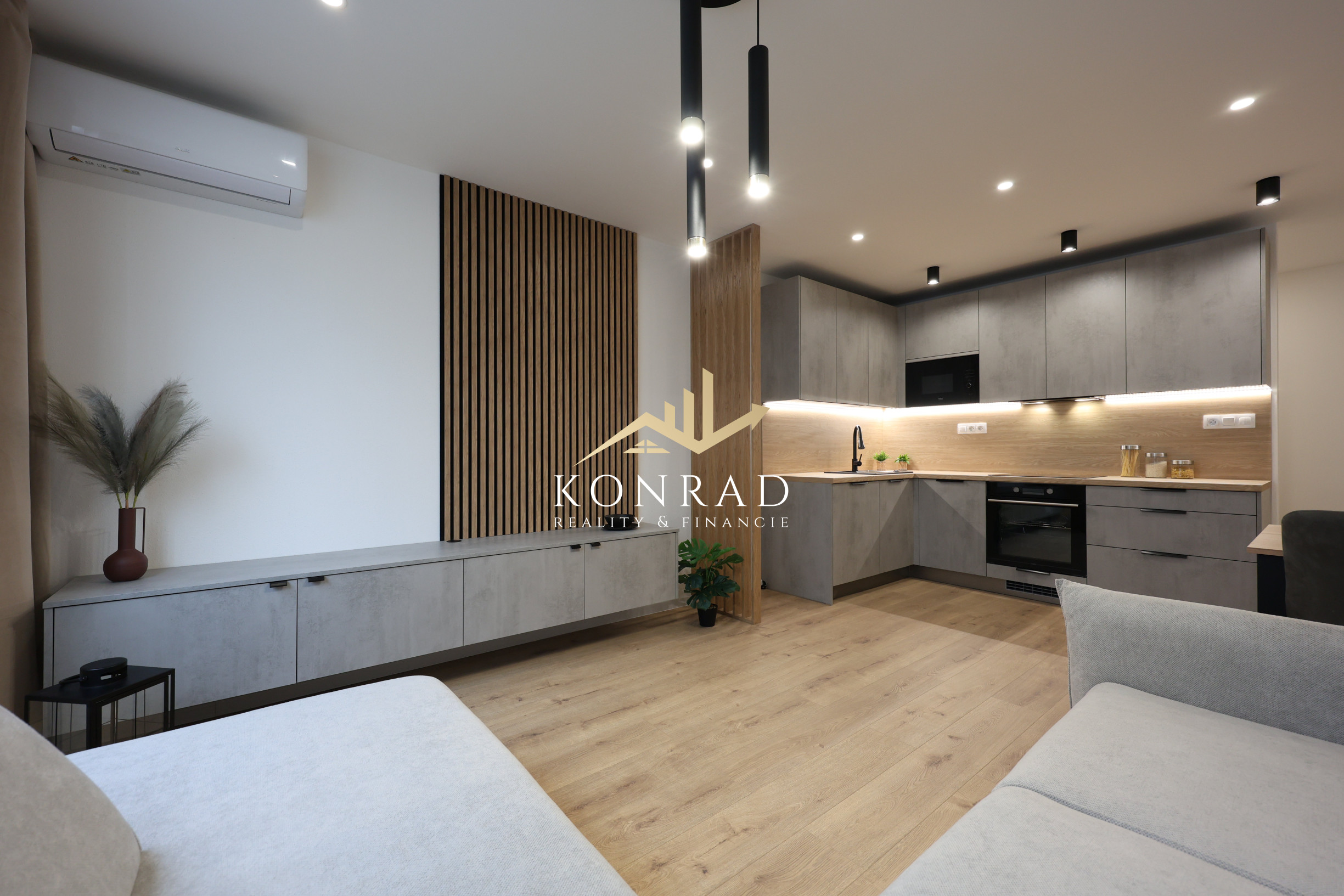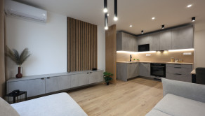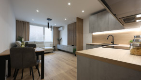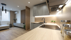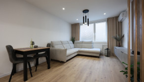 Byt je navyše vybavený klimatizáciou, kuchynskými spotrebičmi a na mieru vyrobenou kuchynskou linkou a nábytkom v obývacej izbe