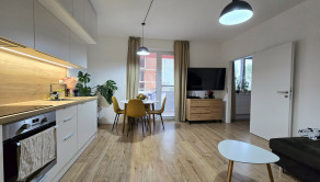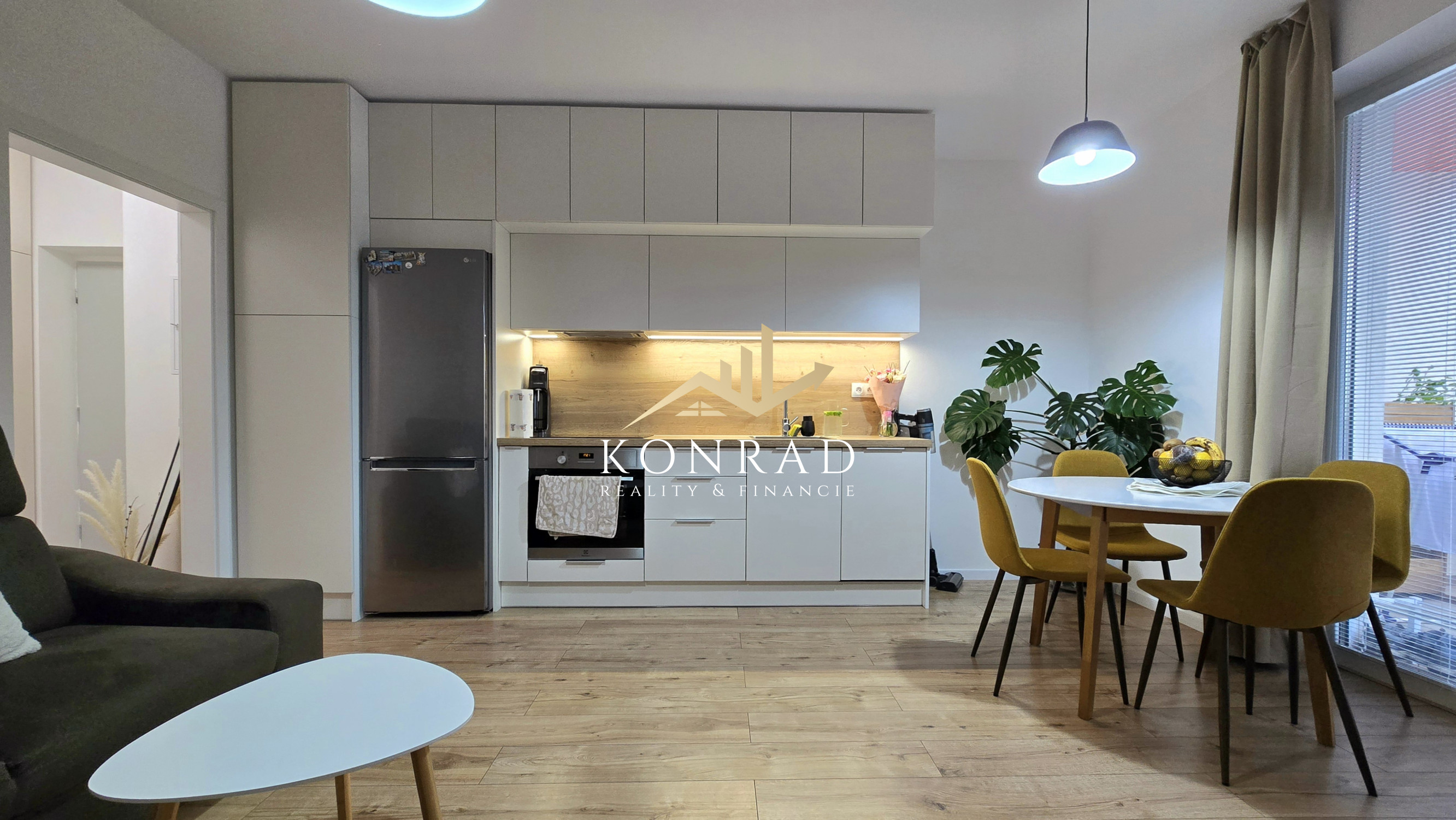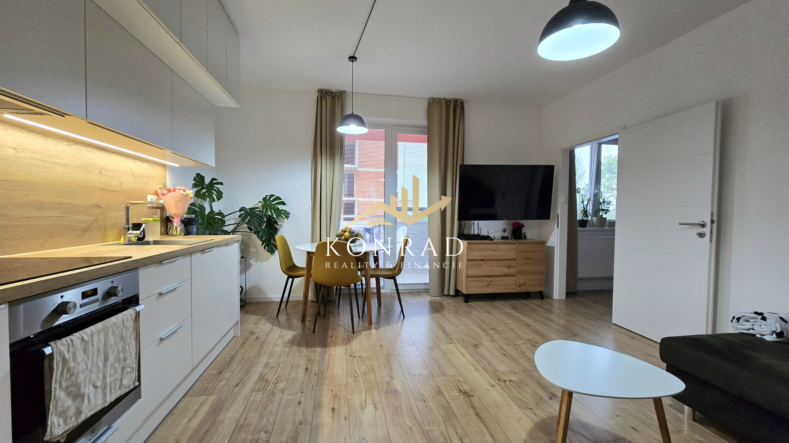 - Byt je veľmi prakticky riešený a vďaka svojej dispozícii pôsobí takmer ako menší dvojizbový byt. Pozostáva zo samostatnej spálne a kuchyne prepojenej s obývacou časťou, čo vytvára príjemný a vzdušný obytný priestor.